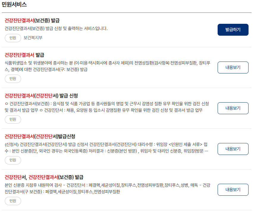- 검색창에 '보건증' 입력: 민원서비스 메뉴에서 '보건증' 또는 '건강진단결과서'를 검색하세요.